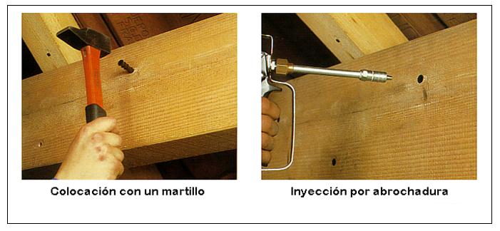 Una vez realizadas todas las perforaciones y colocados todos los tacos, se procede a la inyección a presión del insecticida, mediante una bomba de alta presión conectada a una pistola inyectora.