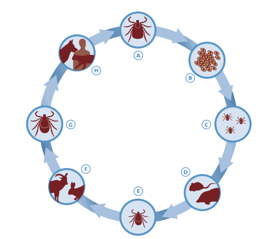 Las hembras se alimentan de sangre durante 5 a 14 días de un mamífero hospedador de gran tamaño, como por ejemplo, perro, ganado vacuno o herbívoros silvestres.
